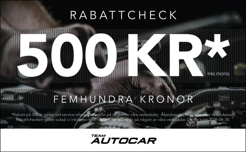 *Rabattchecken fås efter genomförd provkörning och gäller t.om 2026-06-30 och kan endast användas hos Team Autocar vid betalning och kan inte lösas in till pengar.